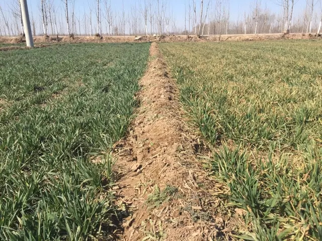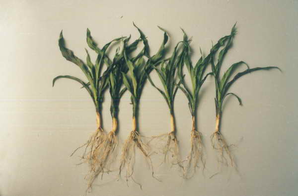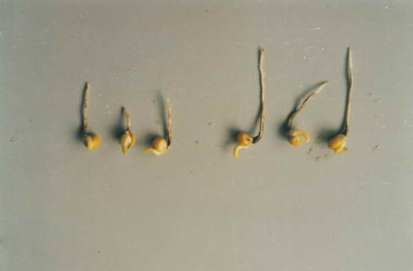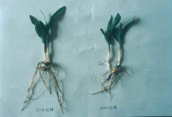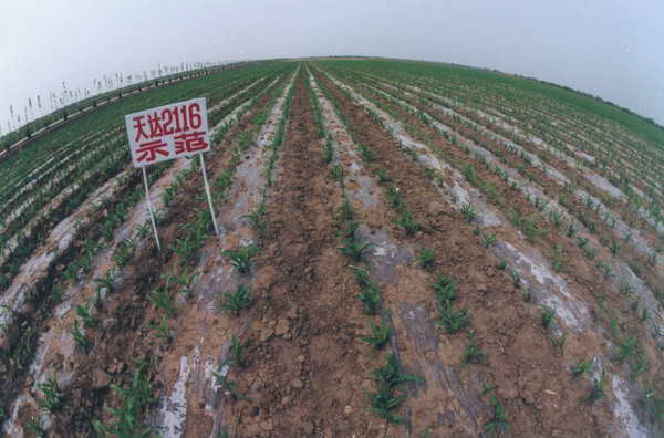 國家級農(nóng)業(yè)開發(fā)周陽項目區(qū) 內(nèi)玉米浸種出苗18天對比情 況,左為處理,右為對照。 1999年5月24號