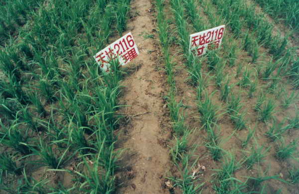 國家農(nóng)業(yè)部注溝巴西旱稻試 驗基地巴西旱稻出苗45天對 比情況。 1999年7月17號