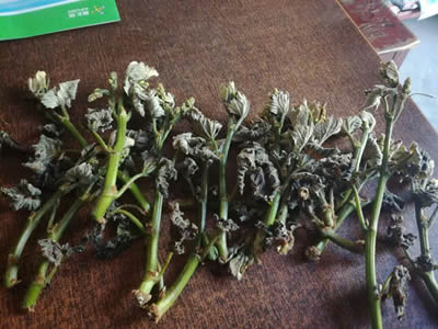 2018年4月6日晚一場霜凍,造成大面積果樹花芽嚴重受損,陜西乾縣、洛川、黃陵、宜川等地都受到不同程度的凍害。這是乾縣太平嶺的葡萄新枝在普通管理情況下受到霜凍后的慘狀: 同樣是太平嶺的金嶺村張長文所種的葡萄,在4月3日噴藥時加入1000倍的2116,4月8日去田間觀看的效果,葡萄的新技蔥綠挺立: 乾縣乾陵鄉(xiāng)張家堡李行軍,4月2日噴藥時加入1000倍的天達2116,4月8日傳來田家照片,葡萄新技生長正常: 還有五谷豐專業(yè)合作社老扳劉新志發(fā)來的照片:凍害前三天打了天達2116,桃杏生長強。 這些都是乾縣客戶李俊琦反饋過來的。