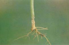 多在床溫較高或育苗后期發(fā)生,主要為害幼苗莖基部或地下根部,初在莖部出現(xiàn)橢圓形或不整形暗褐色病斑,逐漸向里凹陷,邊緣較明顯,擴(kuò)展后繞莖一周,致莖部萎縮干枯,后瓜苗死亡,但不折倒。根部染病多在近地表根莖處,皮層變褐色或腐爛。在苗床內(nèi),開始時(shí)僅個(gè)別瓜苗白天萎蔫,夜間恢復(fù),經(jīng)數(shù)日反復(fù)后,病株萎蔫枯死,早期與猝倒病不易區(qū)別。但病情擴(kuò)展后,病株不猝倒,病部具輪紋或不十分明顯的淡褐色蛛絲狀霉,即病菌的菌絲體或菌核,且病程進(jìn)展慢,別于猝倒病。