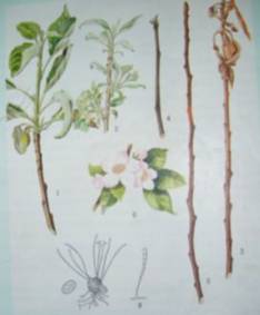 3、病原:蘋果白粉病菌屬子囊菌綱,白粉菌目,白粉病科,叉絲單囊殼屬。無(wú)性時(shí)代,屬半知菌類,從梗孢目,從梗孢科,粉孢屬。菌絲白色,浮生于寄主表面,以吸器伸入寄主表皮細(xì)胞。分生孢子散生,直立無(wú)分支,頂端串生分生孢子;分生孢子無(wú)色、單孢、橢圓形,大小28-30×12微米。閉囊殼棕褐色,球形或近球形,半埋于菌絲中,生兩種附屬絲,一種生在閉囊殼的頂端,3至10條,尖而長(zhǎng),尖端有時(shí)分叉,另一種生在閉囊殼的基部,短粗而彎曲;閉囊殼內(nèi)生一個(gè)子囊;子囊無(wú)色,長(zhǎng)橢圓形,內(nèi)生8個(gè)子囊孢子;子囊孢子無(wú)色,單孢,卵圓形,大小22-26×12-14微米。