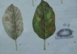 3、病原:蘋果圓斑病菌屬半知菌類,球殼孢目,球殼孢科,葉點(diǎn)霉屬。分生孢子器近球形、扁形或橢圓形;分生孢子單孢、無色、卵形至橢圓形。在葉上所產(chǎn)生的器孢子最小,有一個(gè)突出的孔口;病枝上產(chǎn)生的子實(shí)體有兩種,一是分生孢子器,在果樹生長季節(jié)形成并傳播侵染;另一是孢子器菌核,在夏末和秋季形成,以休眠狀態(tài)越冬,無明顯孔口;果上產(chǎn)生的分生孢子器扁形或橢圓形,孔口不明顯,沒有頸。
