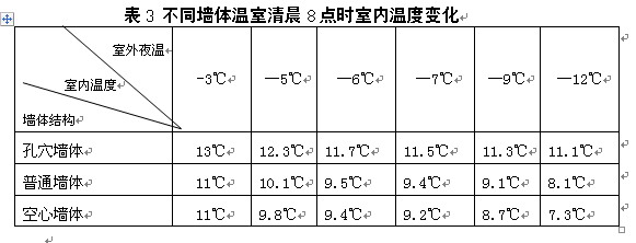 墻體建成后,其內(nèi)壁呈孔洞狀,洞與洞的中心點(diǎn)之間距離,上下左右皆為30厘米。墻內(nèi)空斗必須用干細(xì)土填實(shí),填土要等墻體水泥凝固后、并分層進(jìn)行,即每砌100厘米高左右墻體,填一次土,填后逐層踏實(shí)。待墻體建好并徹底凝固后,再用直徑5厘米、長60厘米、前端削成尖形的洋槐木棍,在內(nèi)壁墻上沿方形孔洞打穴,穴深40—60厘米。這些孔穴在白天高溫時,熱空氣可通過孔穴進(jìn)入墻體內(nèi)部,加熱墻體,提高墻體內(nèi)部溫度,增加蓄積熱量,夜晚墻體降溫,可釋放較多熱量,穩(wěn)定、提高室內(nèi)溫度。實(shí)踐證明,建有孔穴墻體溫室的夜晚溫度可比同等條件下的其它墻體溫室夜溫提高3--4℃(表3)