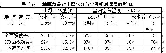 土壟、操作行間覆蓋地膜后,土壤水分蒸發(fā)受到抑制,這不但提高了土壤的溫度(表4)和保水能力,并且降低了室內(nèi)空氣的相對(duì)濕度,(表5)減少了病害的發(fā)生。
